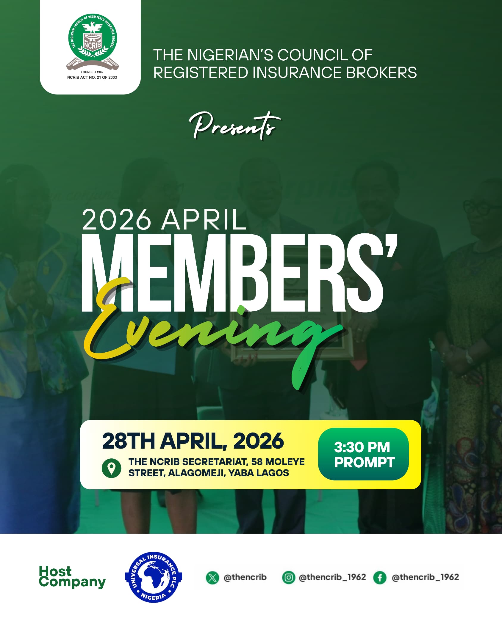 « All Events THE NCRIB 2026 APRIL MEMBERS’ EVENING April 28 @ 15:30 - 17:00 UTC+0 « 2025 NATIONAL INSURANCE BROKERS CONFERENCE AND EXHIBITION + Google Calendar+ iCal Export Details Date: April 28 Time: 15:30 - 17:00